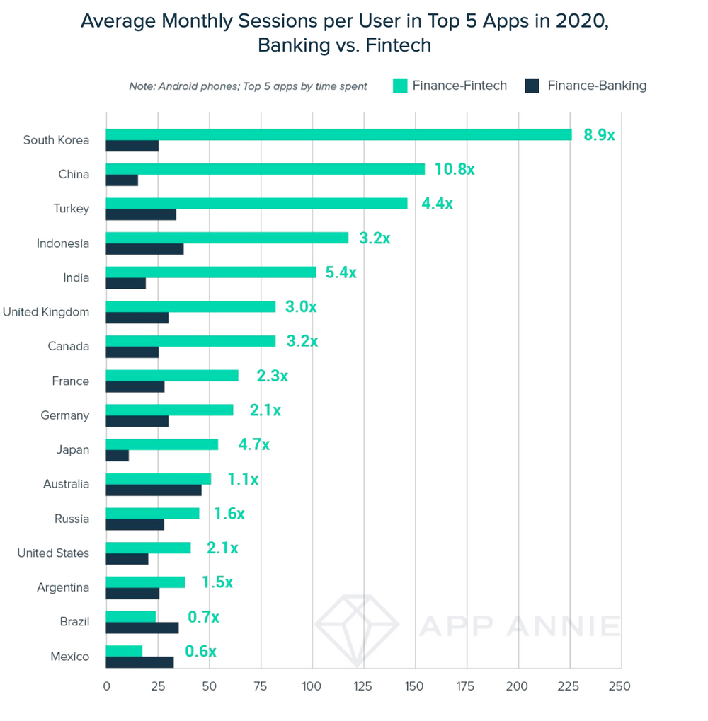 - Fintech applications have demonstrated significantly better performance in terms of user engagement, outperforming the top banking applications by 10.8 times. For example, in South Korea, fintech applications were used and visited on average 225 times per month.