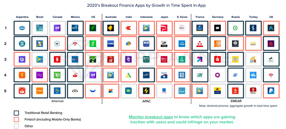 - Retail banking apps continue to be popular in North America and Europe, while fintech apps are rising to the top across the APAC region
